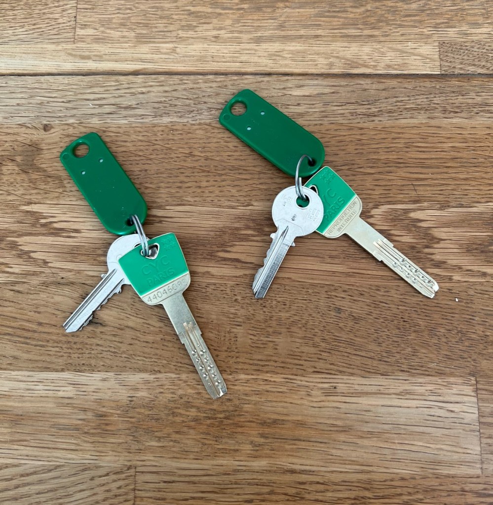 Then the flat is on the third floor, to the left when facing the courtyard. This one opens with the green key. First two floors are easy, as they only get above the “entresol” of this classic old building. The 3rd one is the though one, as the neighbors bellow also have 4m heigh ceilings.
