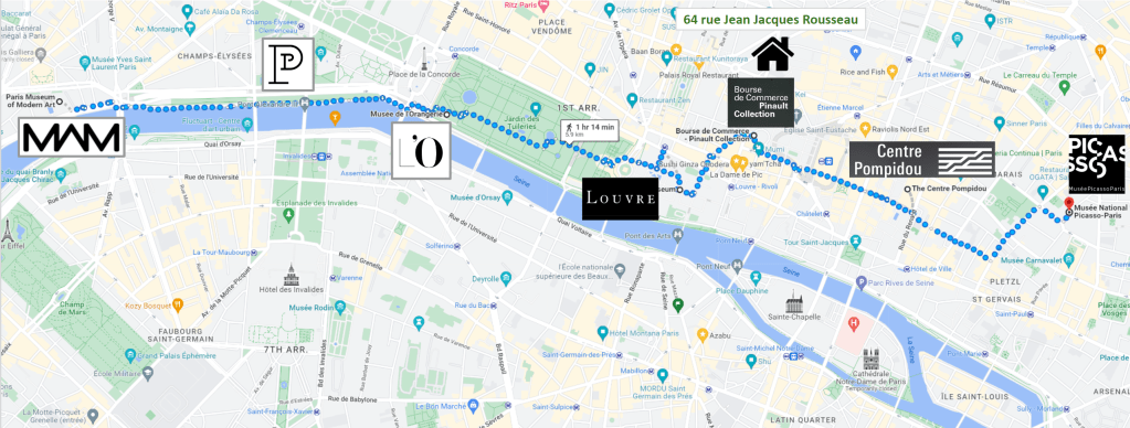 This is an East-West itinerary along the Seine’s right bank seven most famous Museums. A 90mn walk crossing over 3000 years of art and painting history. As you can see, your Paris home is right in the middle, meaning you can start this hike into art history either way.