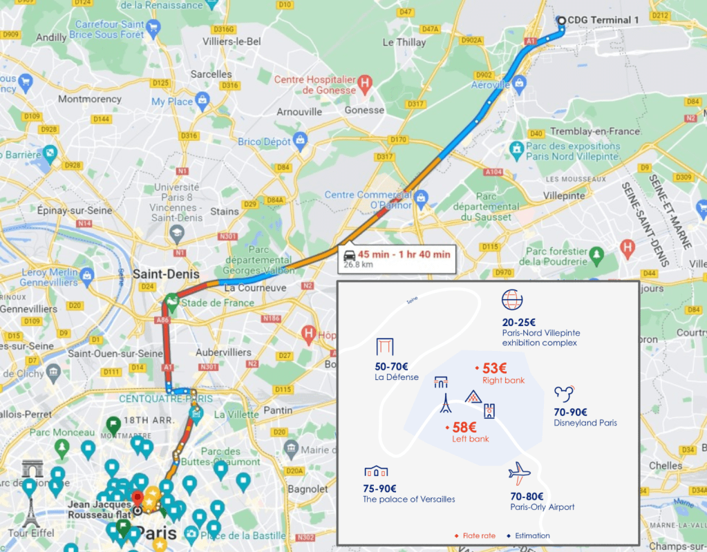 - Time of day: the taxi queue moves faster in CDG than in Orly, that’s a mystery. Nonetheless, on busy hours, it’s common to wait 15 to 30mn before you land your cab. Then, there is the traffic question, especially since there are lots of 2024-Olympic-related public works along the way. Busy time will require up to a 90+mn ride, otherwise count a minimum of 45mn. On average, it’s safe to count on 1h, but the best is to run a gmap estimation when you land.