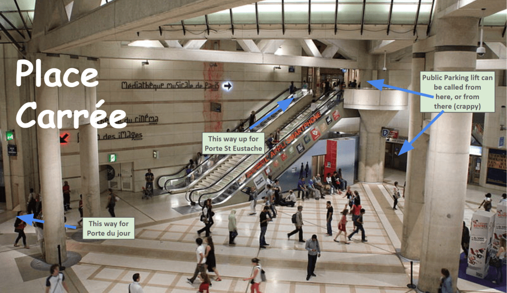- N°5 – Porte St Eustache (the best, although no escalator for the last steps out, but you can use the public parking lift, which will take you directly to street level)